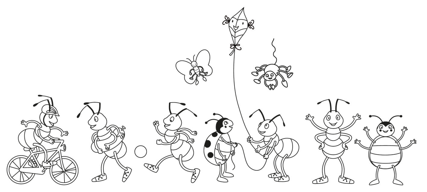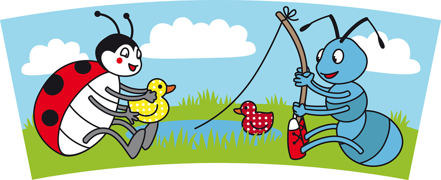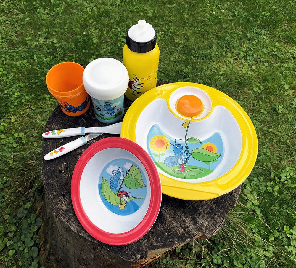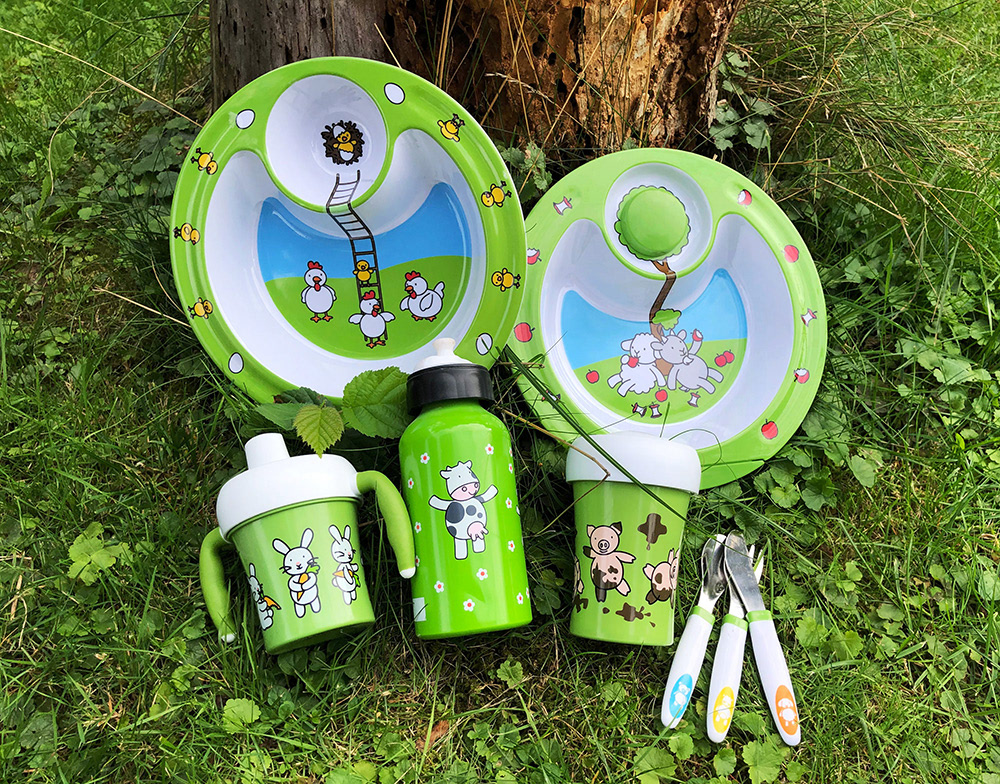 Illustrationen von Charaktären und Szenarien für ein Kindergeschirr zum Thema Bauernhof und Ameise. Entwicklung von der Skizze bis zur Reinzeichnung auf Standskizzen.