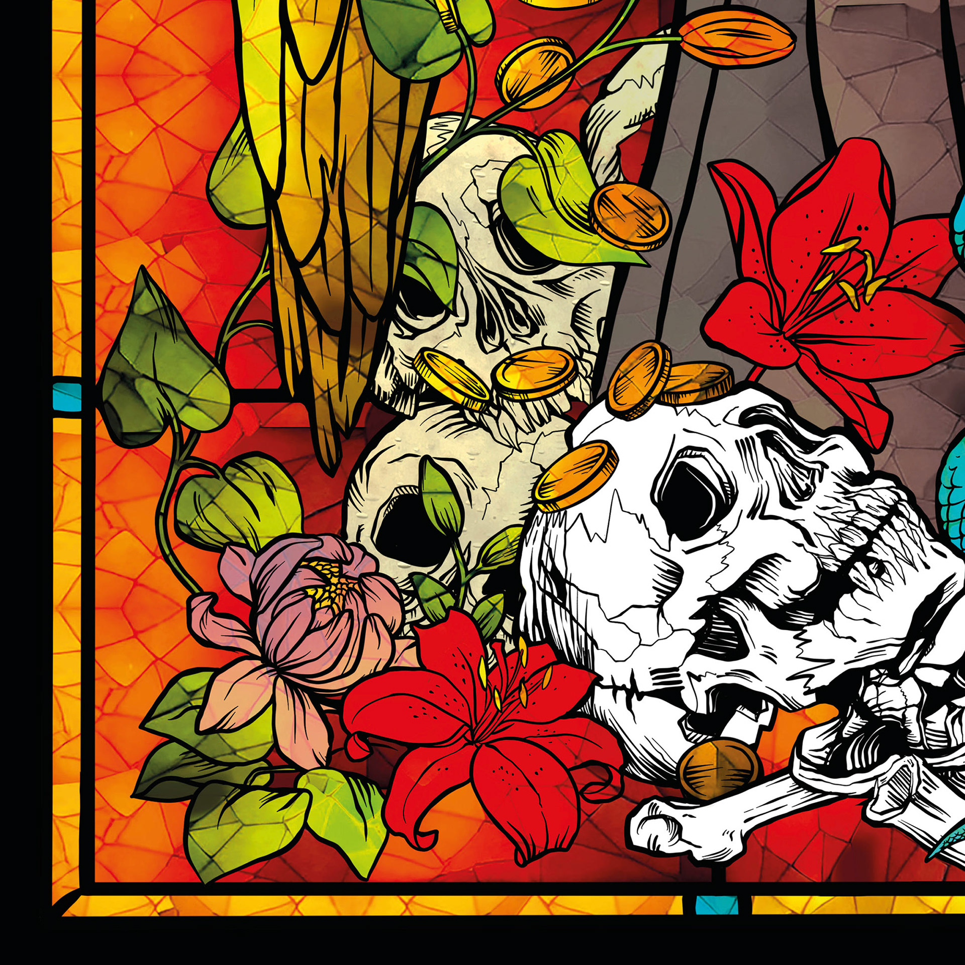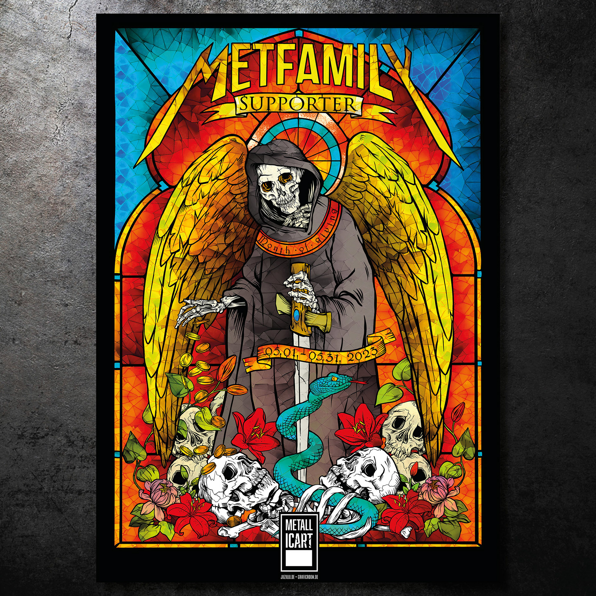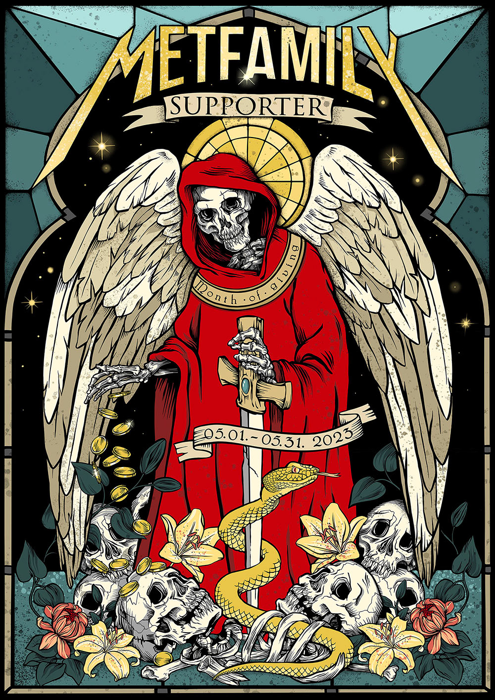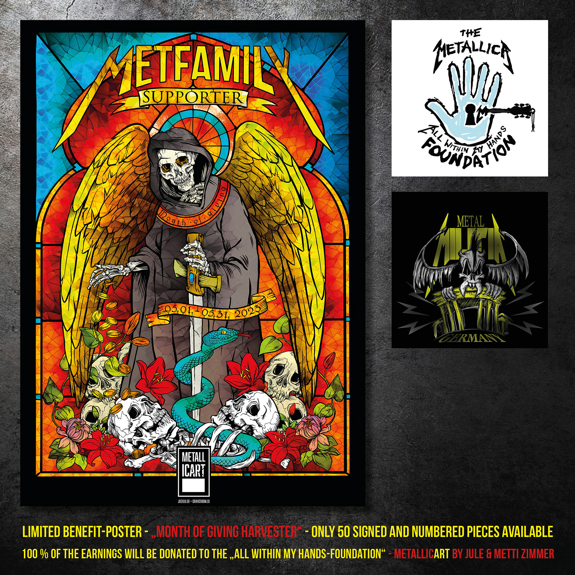 Poster für eine Spendensammlung für die "Metallica - All within my hands foundation" im Stil eines Kirchenfensters.